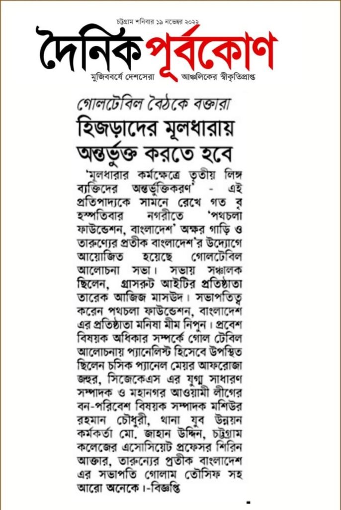 ‘মূলধারার কর্মক্ষেত্রে তৃতীয় লিঙ্গ ব্যক্তিদের অন্তর্ভুক্তিকরণ’—এই প্রতিপাদ্যকে সামনে রেখে চট্টগ্রামে অনুষ্ঠিত হলো একটি গঠনমূলক গোলটেবিল আলোচনা সভা। এই আয়োজন যৌথভাবে করেছে পথচলা ফাউন্ডেশন, বাংলাদেশ, অক্ষর গাড়ি এবং তারুণ্যের প্রতীক বাংলাদেশ।